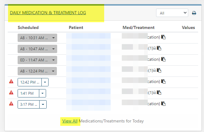 The "Daily Medication and Treatment Log" can be printed using the icon at the top corner of the card or the top right corner of the card on the view all medications and treatments page.