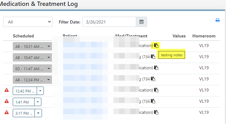 Medications or Treatments with notes attached to them will be indicated with a small clipboard at the end of the name of the medication or treatment. You can view the note by hovering over the clipboard.