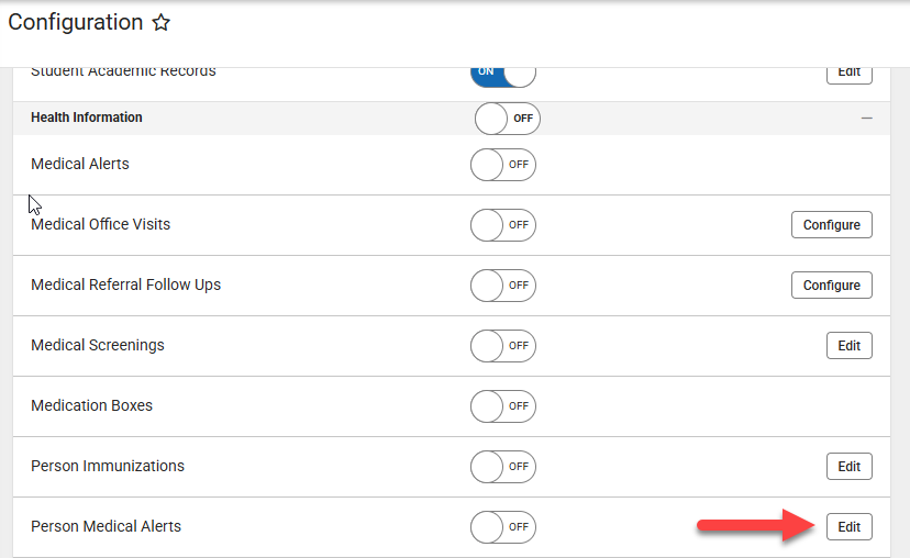 - From the Configure screen Scroll down to Health Information and select the Edit button next to the Person Medical Alerts.