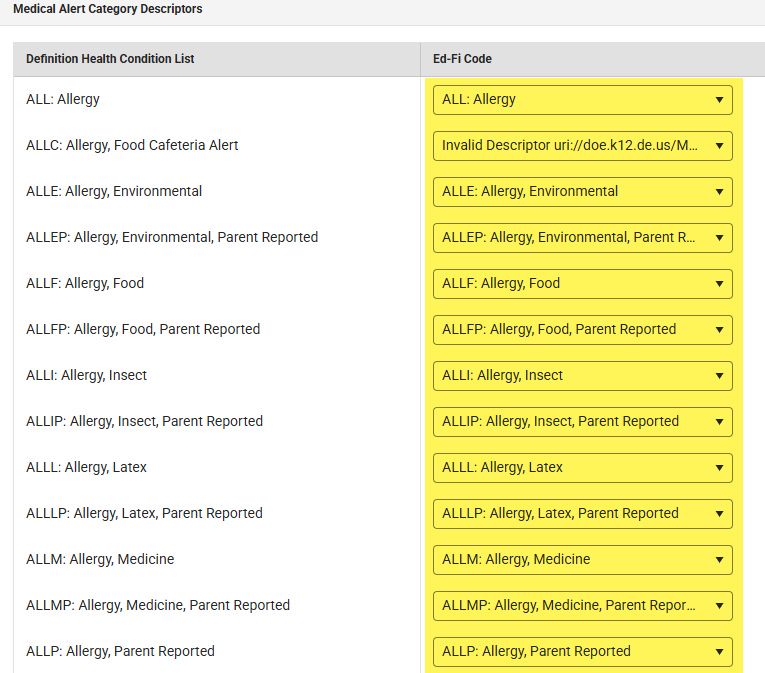- Once the Person Medical Alerts are all mapped to Ed Fi codes and the Person Medical Alerts toggle is on resync with Ed Fi. This will send Health Alerts out to Ed Fi to be retrieved by DSC nightly.
